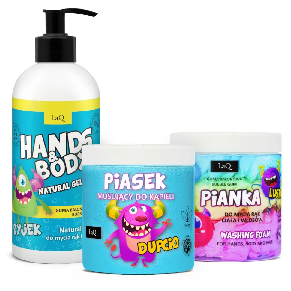 Oto ja, czyli wegański zestaw kosmetyków naturalnych dla dziecka, składający się z żelu do mycia, 3-kolorowej pianki do mycia oraz musującego piasku do kąpieli. Seria ta ma odlotowy zapach gumy balonowej oraz marakui. Stworzyliśmy ją specjalnie dla dzieci, z myślą o ich delikatnej skórze i miłości do kolorów.
