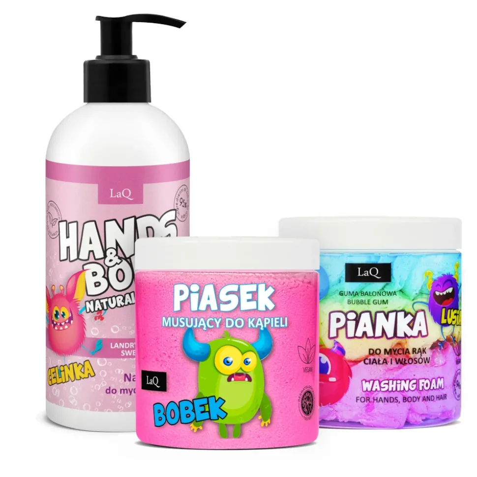 Oto ja, czyli wegański zestaw kosmetyków naturalnych dla dziecka, składający się z żelu do mycia, 3-kolorowej pianki do mycia oraz musującego piasku do kąpieli. Seria ta ma odlotowyzapach gumy balonowej, landrynek oraz wiśni. Stworzyliśmy ją specjalnie dla dzieci, z myślą o ich delikatnej skórze i miłości do kolorów.