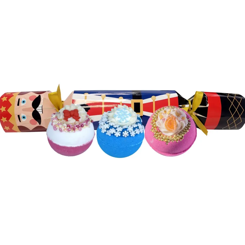 Dziadek do orzechów siedzi pod świątecznym drzewem, strażnik opowieści z dzieciństwa i ręcznierobionych prezentów! Otwórz go, aby odkryć 3 ręcznie robione kule do kąpieli, które z pewnościąsprawią, że poczujesz się słodszy niż cukrowa wróżka!